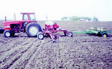 "I call it my poor man's interplanter because I don't have a lot of money invested in it. It's very simple to operate and lets me plant soybeans in 18-in. rows and corn in 36-in. rows," says Denny Neubauer, Radcliffe, Iowa. He owned an IH 500 3-pt. mounted, 8-row, 36-in. planter equipped with newer-style model 800 row units as well as lift assist wheels. He paid for a used Deere 7000 8-row, 30-in. planter equipped with Kinze bean meters and converted it to a 7-row, 36-in. planter. He pulls the Deere planter behind the IH planter when planting beans. To split the rows made by the IH planter, he offset the row units on the Deere planter and mounted a hitch on back of the IH planter. The Deere planter has a single row unit at the center, which results in two 30-in. skip rows for spraying. To raise and lower the Deere planter, he "T'd" the the lift assist wheel hydraulics on the IH planter into the Deere planter's hydraulics. He also shortened up the IH planter markers on each side by 18 in. and extended the planter's monitor extension cord back to the Deere planter. " It saved me a lot of money because new interplanters that do what this rig does sell for much more than what I spent," says Neubauer. "I used it last spring to plant more than 700 acres of soybeans and it worked great, even though I had to go through some pretty tough wet spots. Yields ranged from 50 to 67 bu. per acre. I planted about 175,000 seeds per acre. I think the narrow 18-in. rows resulted in a 3 to 4 bu. per acre yield advantage, so my Deere interplanter paid for itself the first year. The narrow rows provide early shading which reduces the need for herbicides. I planted some Roundup Ready beans but mostly conventional beans. "My neighbor Jim Spaid made most of the modifications to the Deere planter, but the entire neighborhood contributed ideas. "I use the IH planter by itself to plant corn. To plant soybeans I back the IH planter up to the Deere planter and hitch it up, then hook up the hydraulic hose and the monitor cord. I didn't have to add any extra control levers in order to raise or lower the Deere planter. Instead, I use the same hydraulic lever that controls the lift assist wheels on the IH planter to raise or lower the Deere planter. I raise the IH planter on-the-go at the end of the field, and by some engineering fluke there's a delay in the hydraulics so that the Deere planter raises up at about exactly the same spot as the IH planter. "I thought that I'd have problems turning at the end of the field, but the long hitch on the Deere planter allows it to turn tight behind the IH planter."