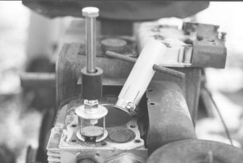 "When exhaust valves stick on L-head type air or liquid cooled engines, I use a pair of simple low cost tools that I made to lift the valves and lubricate the stems," says Chester Clark, Ewing, Mo. "They let me free stuck valves quickly without costly valve removal, grinding, and readjustment. Works on smaller air-cooled engines such as Briggs & Stratton and Wisconsin, which have valves in the block and not in the head. "One of the tools is used to lift the valve and the other for rotating. The lifting tool is made from two flat washers about 1/16-in. thick. The lower washer is notched to make room for the valve stem. It slides under the valve head. I welded three 1 1/2-in. long spacers vertically to the edges of the washers -- two opposite each other and across from the center line of the hole and the other opposite the notch on the washer -- to form a valve head cage assembly. A small slide weight is placed on a 6-in. long bolt, then a nut is threaded on so that a 3/4-in. length of threads is exposed. Then the bolt is inserted into the top washer on the lifter and tightened with another nut. "The sliding weight is then used to pull the valve. "The rotating tool is made from a short length of plastic pipe or pvc conduit which is sized to just slip over the outside diameter of the valve head. I cut 6 or 8 equal spaced slots 1 1/2 in. deep into one end of the pipe. I drilled a 3/8-in. dia. hole through both sides about 1 1/2 in. from the other end of the pipe. Then I slipped a radiator hose clamp over the slotted end and tightened it lightly to keep it on the pipe. "I clean and lubricate the valve stem when the valve is in the maximum lifted position. Since it is usually the exhaust valve that's stuck in the 'up' position, I rotate the engine until the piston is just past top dead center on the exhaust stroke for that cylinder. I apply a small amount of lubricant or other loosening agent to the stem. Then I slip the notch of the lifting section of the too under the valve head. The slide hammer action will free the valve and overcome the valve spring tension. The cleaned area on the stem should extend 1/8 in. beyond the normal travel range. Remove the lifting tool. "Again apply a small amount of loosening agent to the stem. Slip the rotating too over the valve head and tighten the clamp Insert a bar or screwdriver shank through the holes. Use a repeated 30 degree rotating and lifting action to thoroughly clean the stem Repeat this operation until the spring always returns the end of the stem back down onto the lifter from the extended travel range. Repeat the previous steps several times on all exposed valves. Rotate the engine crankshaft several times to cycle the valves and check for any sticking. "This procedure usually requires less than a half hour and restores an engine to its original operating condition."