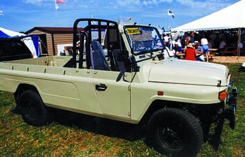 "The bed has stake holes and tie-downs, and the rear tailgate folds down for easy loading. The bumpers are made from spring steel. The front bumper has twin tow hooks and a brush guard above them that's fabricated from tubular steel. The rear bumper has a military style hook."