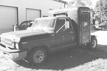 The "semi" pickup evolved from a 1978 Ford 100 1/2-ton. Its 240 cu. in. 6-cyl. engine with 3-speed manual transmission was blown. To get the truck running again, Ater replaced the bad engine with a 429 cu. in. V-8 with automatic transmission out of a 1972 Mercury Marquis.