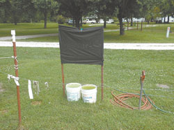 The buckets are filled with dish soap water and set on the ground between a pair of T-posts. A 24-in. wide, 18-in. high section of clear plexiglass is attached to the posts over the buckets, with some landscape fabric above the plexiglass to simulate an animal carcass. The dark fabric above the plexiglass attracts the horse flies and as they fly toward what they think is a meal, they hit the plexiglass and fall into the buckets and drown.