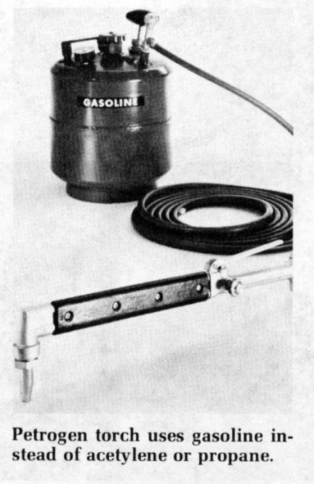 "Gasoline is lighter -- a 2 gal. Petrogen tank weighs 25 lbs., versus 240 lbs. for a full WK cylinder of acetylene."