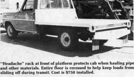 "Most owners keep the pickup box and put it back on when they sell the pickup. The shiny new box makes the old pickup more attractive and thus worth more money," explains Henderson. "Or, if they prefer, we'll take the box in trade on the flat platform. In some cases, farmers and ranchers have ordered pickups direct from the factory without a box, then brought them here to have the platform installed. We prefer to make installations by appointment. We can have a pickup in and out of here, ready to go, in less than 3 hrs."