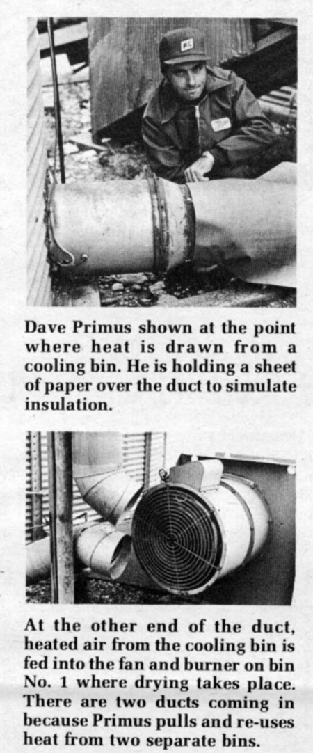 The system pulls heat off the grain that's cooling in the second bin and ducts it back to the original bin -- to the burner and fan. The burner then does not have to supply as much heat for the next batch of grain being dried.