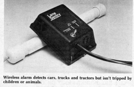 The Lane Sentry system utilizes a probe (12 in. long and 1 in. in dia.) which is buried at the side of the driveway. When any moving metal object passes within 14 ft. of the probe, it activates an alarm located back at headquarters in the home (or in your workshop or wherever else you decide to put it). The probe detects cars, trucks and tractors entering the farm but isn't "tripped" by children or animals. Also, since it requires no "drive over" cable or wire, Lane Sentry isn't bothered by snow or mud, the manufacturer points out.