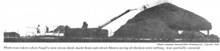 "You don't necessarily have to own a threshing machine or binder to build yourself a straw shed," Nagel points out. "You could bale the straw, then chop up bales and blow them onto the shed with a silo blower or forage chopper," he suggests. He feels that corn residue, including the shucks, would work okay if it were shredded or chopped first.